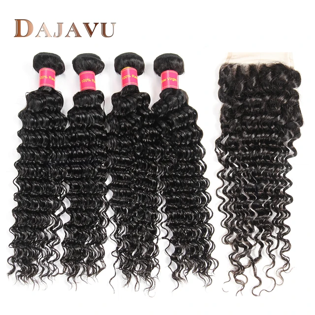 Cheap Dejavu Hair Deep Wave Brazilian Non Remy Human Hair 4 Bundles With Lace Closure Free Part Bundles Hair Extension With Closure Affordable